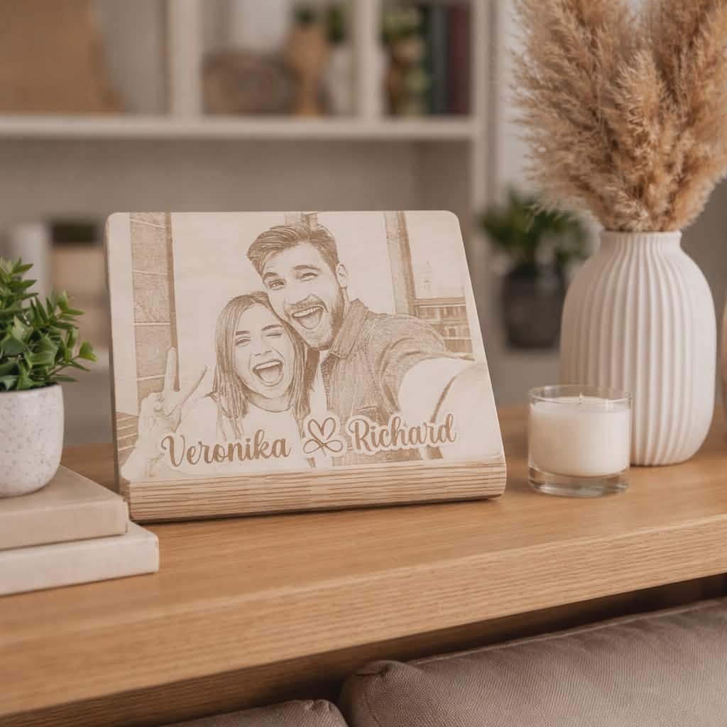 Miesto klasického fotorámika Vám ponúkame originálny drevený rámik na podstavci s Vašou gravírovanou fotkou. Obraz Vám vieme vyrobiť prakticky z akejkoľvek fotky, ak samozrejme nie je rozmazaná :) Fotku Vás poprosíme priložiť do prílohy k objednávke, prípadne zaslať osobitne na lukas.ruzinsky@gmail.com