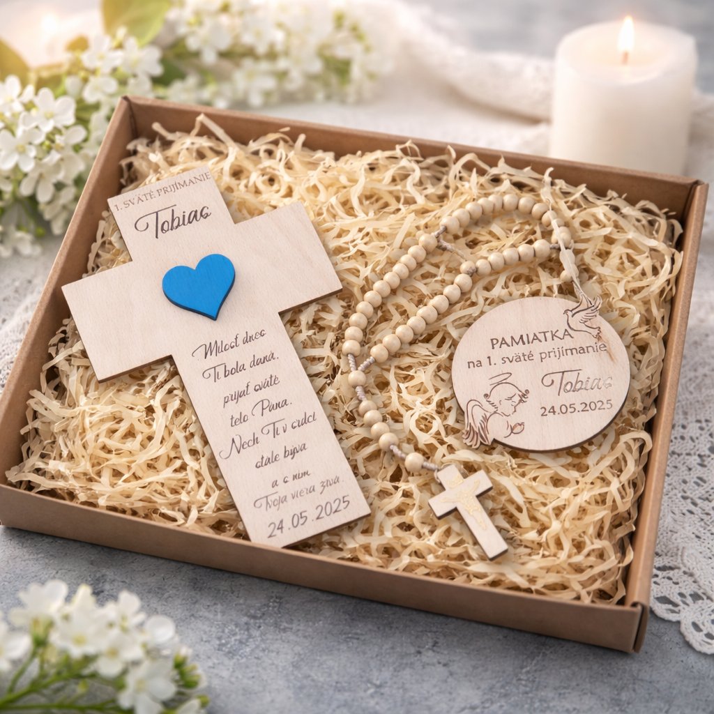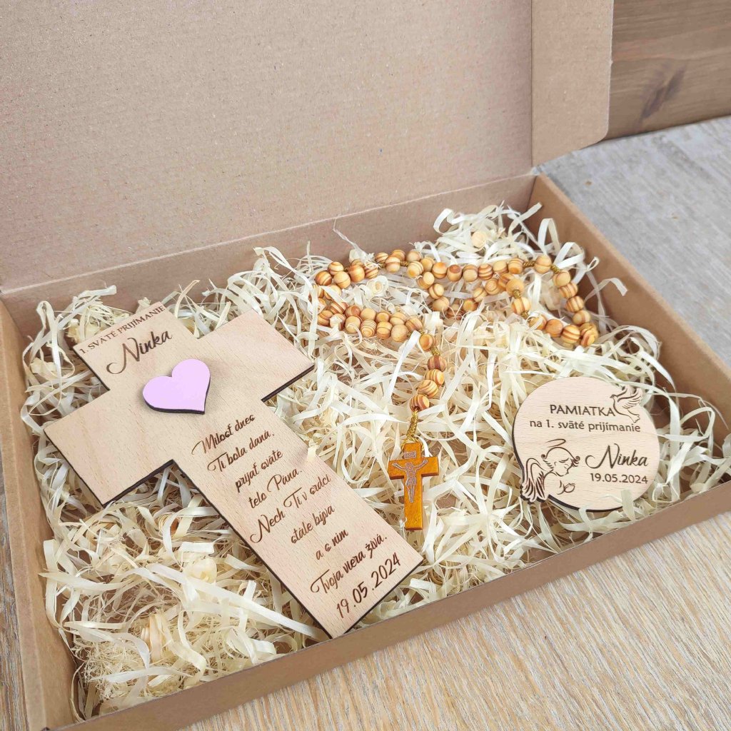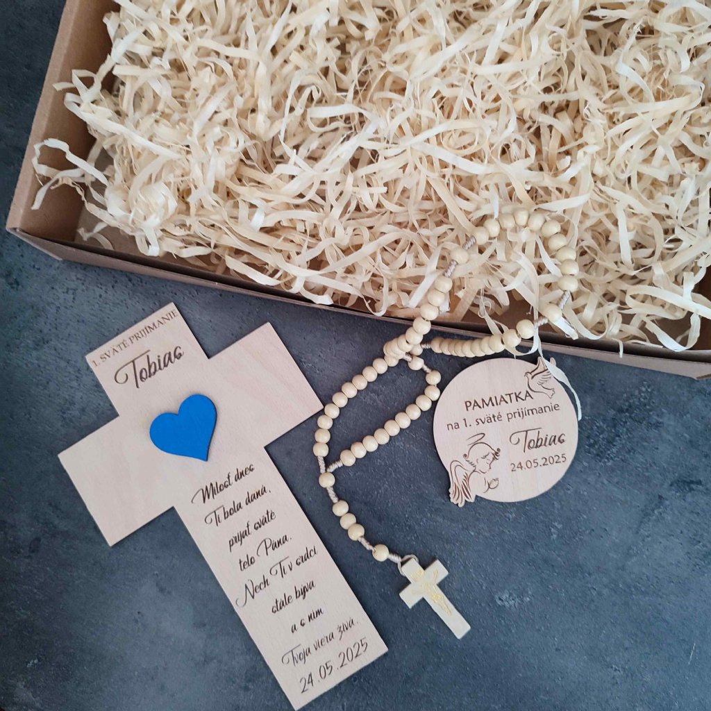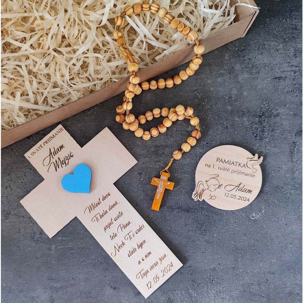 Krásny dar na 1. sväté prijímanie zostane obdarovanému na pamiatku a bude mu pripomínať tento dôležitý deň. Set sa skladá z krížika s ružovým alebo modrým srdiečkom, okrúhlej magnetky a dreveného ruženca (typ ruženca dodávame podľa aktuálnej dostupnosti). Všetko je uložené v kartónovej krabici vystlanej drevenými hoblinami.